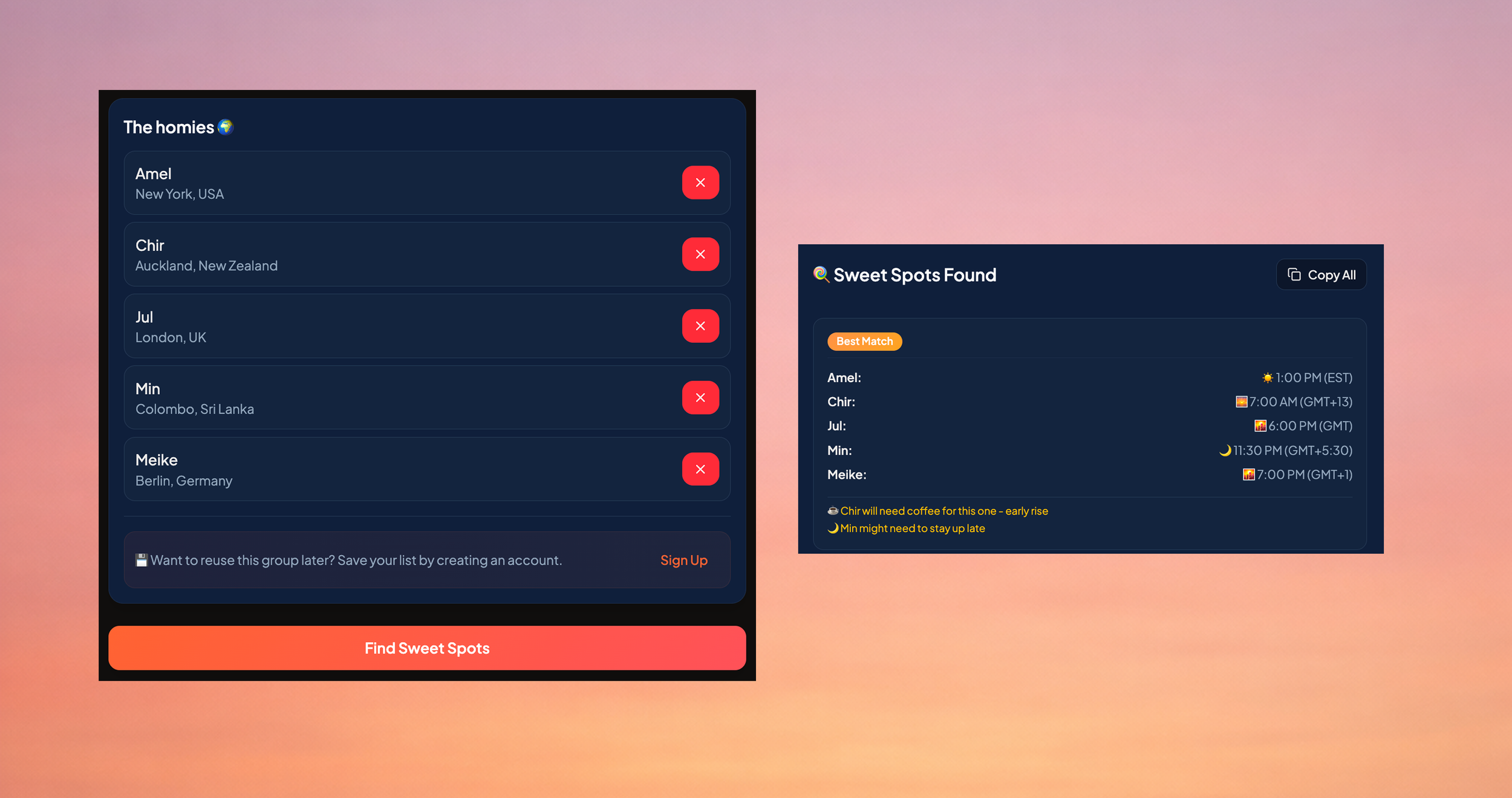 Every time we tried to plan a call, we’d end up bouncing between janky time-zone websites, copy-pasting times into WhatsApp, and still somehow getting it wrong. It wasn’t seamless, and it definitely wasn’t fun.
