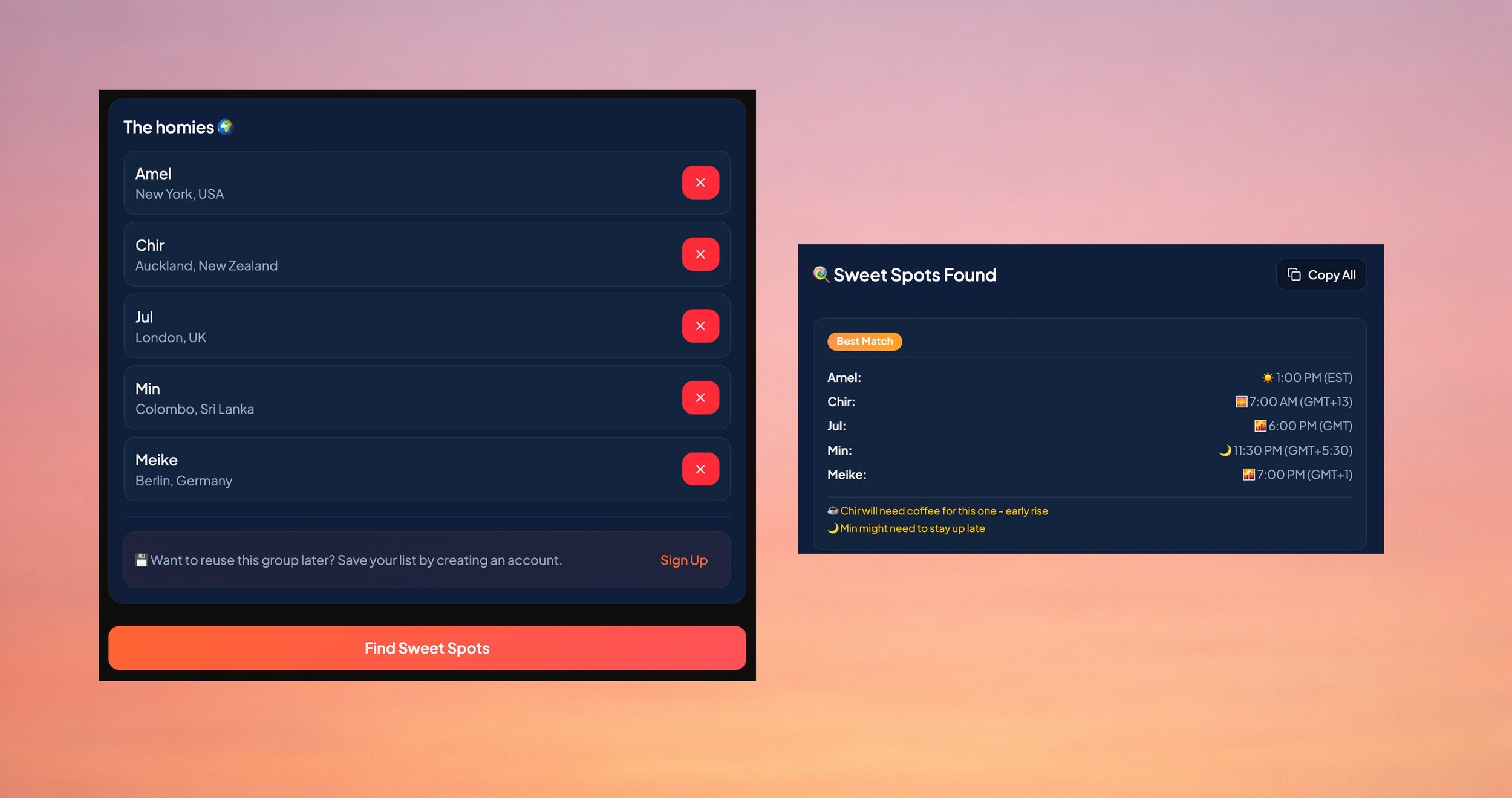 Built while experimenting with AI and vibe coding, TCK Time helps distributed friend groups quickly find time windows that work across time zones.